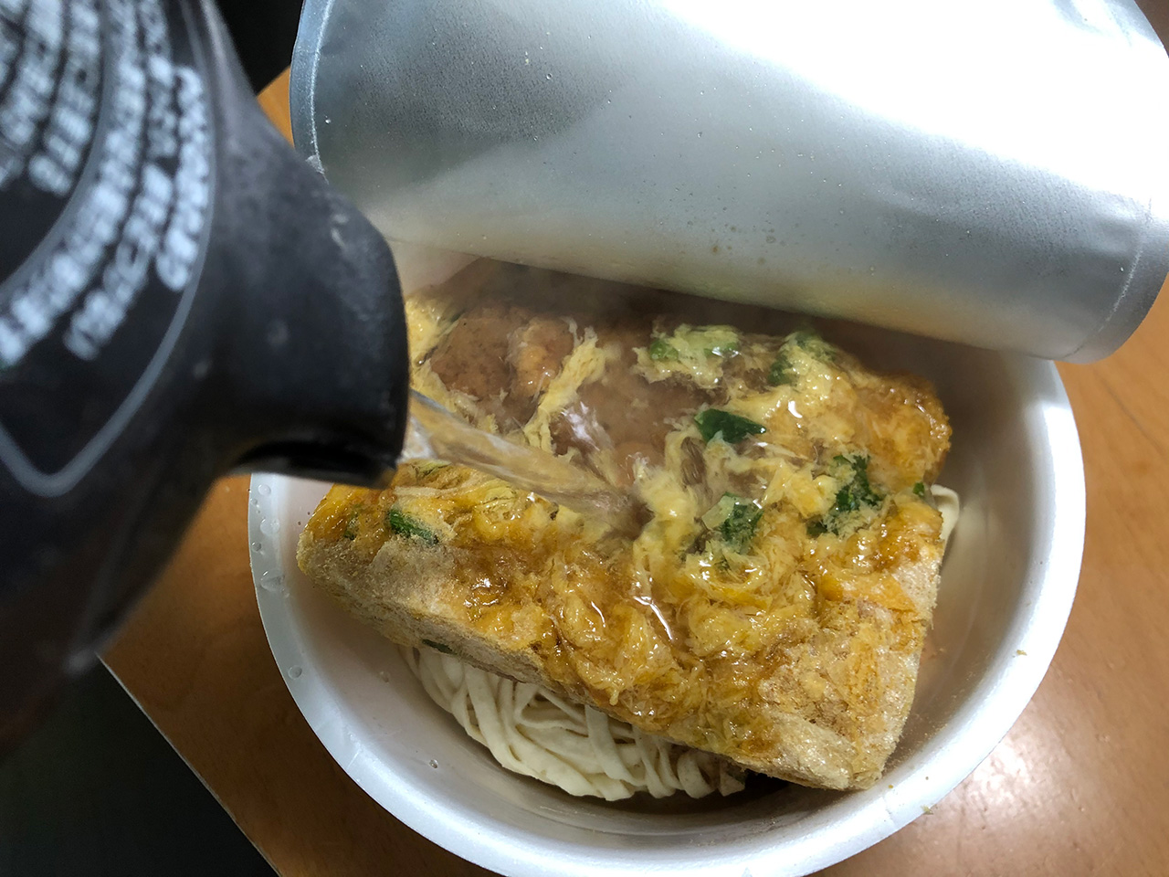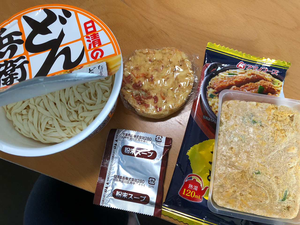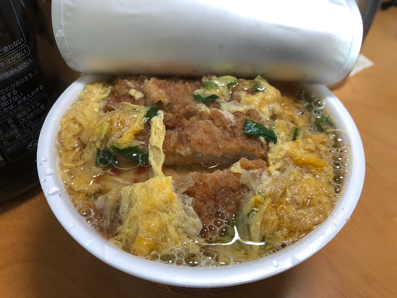 賞味期限を半年ほど過ぎたアマノフーズの「チキンカツの玉子とじ」があったのだが、ご飯が手元にない。しかも昨晩あまり食べなかったので、少しがっつり今朝は行きたいと。そこで思い付きでやってみました。「どん兵衛鬼かき揚げ天ぷらうどん」に、こいつをトッピングしてやろうじゃないか。