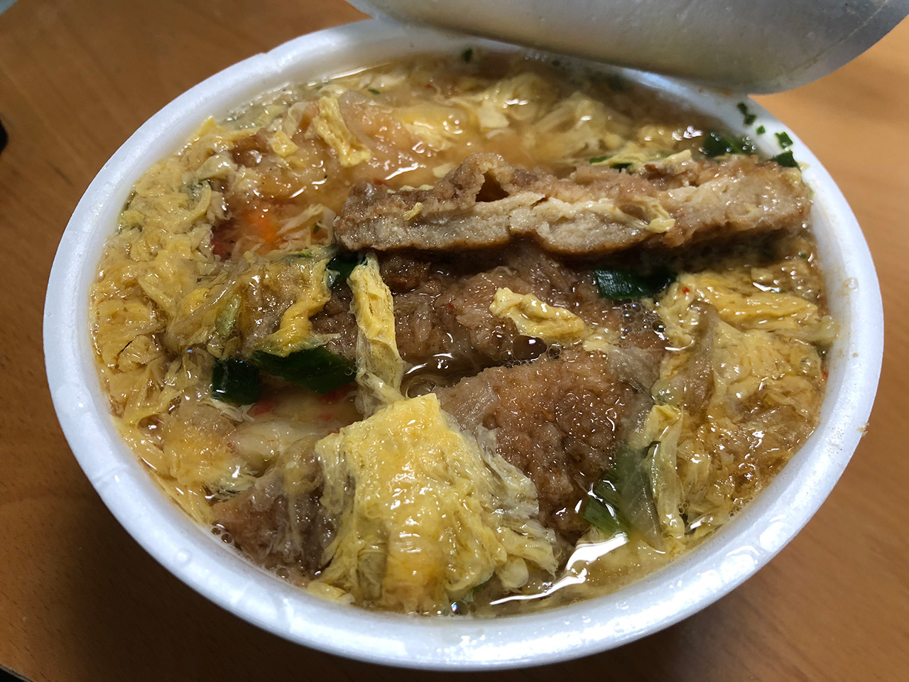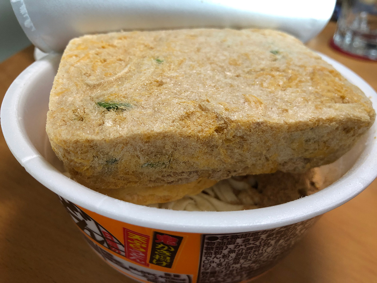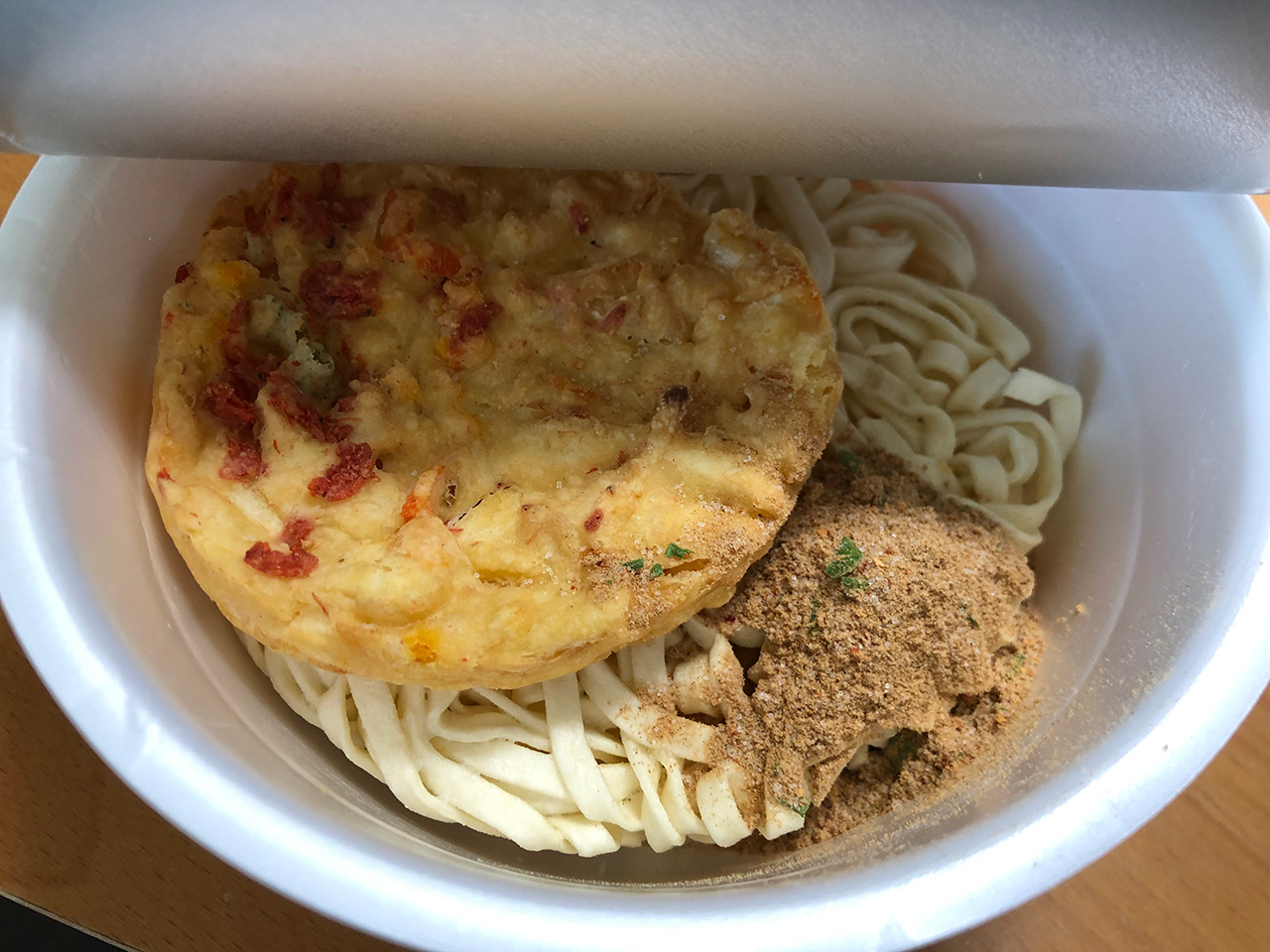 賞味期限を半年ほど過ぎたアマノフーズの「チキンカツの玉子とじ」があったのだが、ご飯が手元にない。しかも昨晩あまり食べなかったので、少しがっつり今朝は行きたいと。そこで思い付きでやってみました。「どん兵衛鬼かき揚げ天ぷらうどん」に、こいつをトッピングしてやろうじゃないか。
